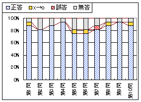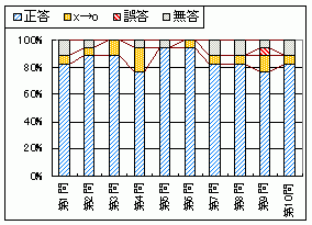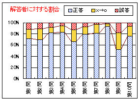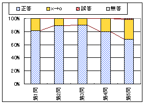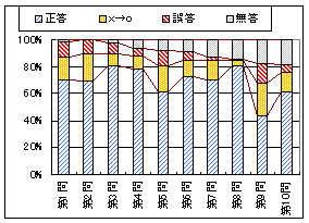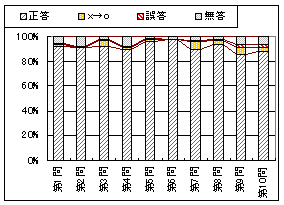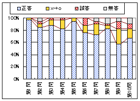 左のグラフ1は問題ごとの正答,誤答,無答の割合(正誤は最初の採点)で,黄色で示したものは初め誤答で再試行の結果正答に変った割合を表わす.