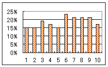 グラフ3は横軸が問題番号,縦軸は試行回数を表わす.(ただし,同一問題を16回以上試行した答案については16回と見なす.)