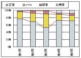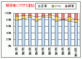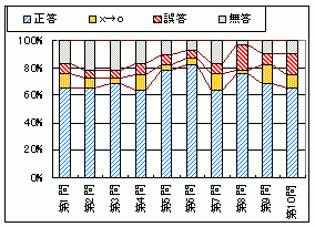 左のグラフ1は問題ごとの正答,誤答,無答の割合(正誤は最初の採点)で,黄色で示したものは初め誤答で再試行の結果正答に変った割合を表わす.