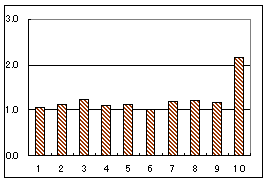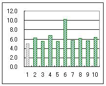 グラフ2は横軸が問題番号,縦軸は直前の操作以降その問題の採点までの経過時間(秒)を表わす.ただし,第1問は初めからの時間.