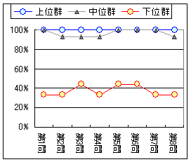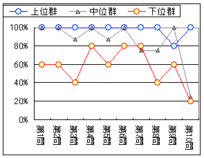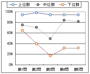 また,グラフ4は合計得点によって回答者を上位群,下位群(各27%),中位群(残り)に分けたときの問題別正答率である.