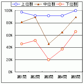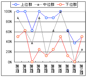 表1は各問題の得点と残りの問題の合計得点との相関係数で,第10問においてイレギュラーなことが起こっている可能性がある.これを上位群,中位群,下位群各33.3%のグラフにしたグラフ4で確かめると,第10問において下位群と上位群が等しく下位群と中位群の逆転が見られ,第10問は合計得点で表わされる学力を反映していないことが分かる.