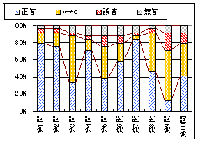 左のグラフ1は問題ごとの正答,誤答,無答の割合(正誤は最初の採点)で,黄色で示したものは初め誤答で再試行の結果正答に変った割合を表わす.