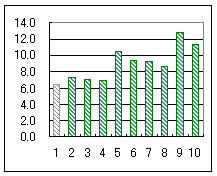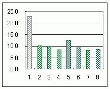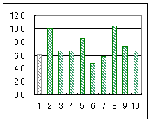 グラフ2は横軸が問題番号,縦軸は直前の操作以降その問題の採点までの経過時間(秒)を表わす.ただし,第1問は解説を読む時間を含む.