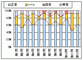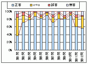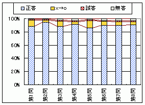 左のグラフ1は問題ごとの正答,誤答,無答の割合(正誤は最初の採点)で,黄色で示したものは初め誤答で再試行の結果正答に変った割合を表わす.