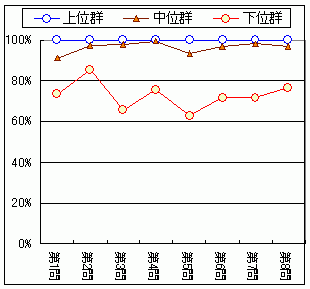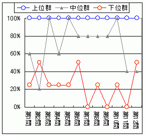 表2は各問題の得点と残りの問題の合計得点との相関(I-R相関),グラフ4は回答者全体をその合計得点によって上位群,中位群,下位群(各3分の1)に分けたときの群別・問題別正答率のグラフである.