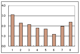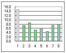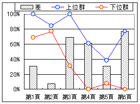 グラフ5は合計得点によって回答者全体を上位群と下位群(各50%)に分けたときの問題別正答率である.これによれば,第7問,第8問が得点差が出やすい問題であることが分かる.