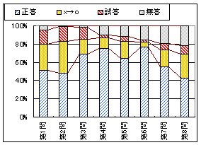 左のグラフ1は問題ごとの正答,誤答,無答の割合(正誤は最初の採点)で,黄色で示したものは初め誤答で再試行の結果正答に変った割合を表わす.この頁については無答答案が多いので「正答率」という用語の通常の使用法に従って解答者に対する割合もその下に示す.