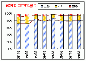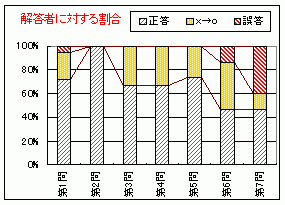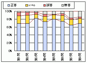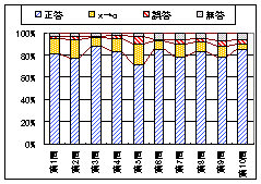 左のグラフ1は問題ごとの正答,誤答,無答の割合(正誤は最初の採点)で,黄色で示したものは初め誤答で再試行の結果正答に変った割合を表わす.その下のグラフは「正答率」の通常の定義に従って,無答者を除く解答者に対する割合で示したもの.