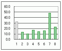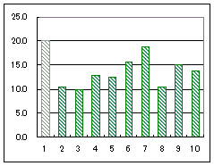 グラフ2は横軸が問題番号,縦軸は直前の操作以降その問題の採点までの経過時間(秒)を表わす.ただし,第1問は解説を読む時間を含む.