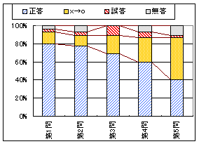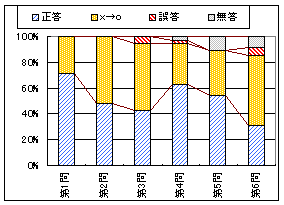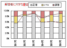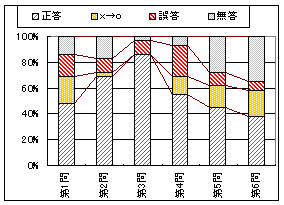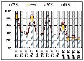 左のグラフ1は問題ごとの正答,誤答,無答の割合(正誤は最初の採点)で,黄色で示したものは初め誤答で再試行の結果正答に変った割合を表わす.この頁については無答答案が多いので,正答率の通常の定義に従って無答を除いた解答者に対する割合をその下に示す.