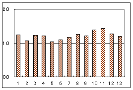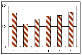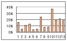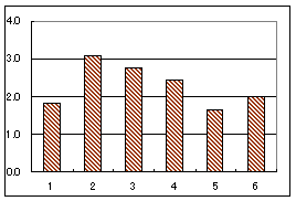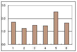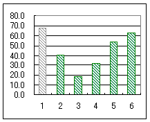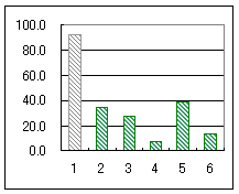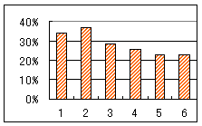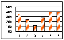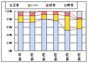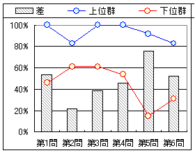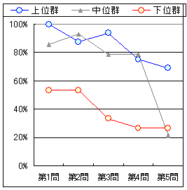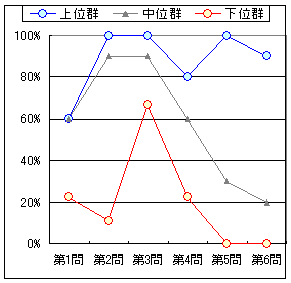 グラフ6は回答者全体をその合計得点によって上位群,中位群,下位群の3群に等分したときの群別・問題別正答率である.これによれば,第1問において中位群が上位群と接している他は,UL指数(上位群の正答率-下位群の正答率)も高く,どの問題も識別力が高い.