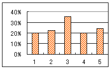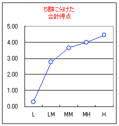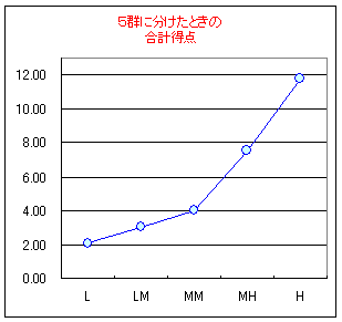 グラフ5は回答者全体をその合計得点によって高(H)〜低(L)の5群に等分したときの群別正答率である.これによれば,合計得点はどの群に対しても識別力が高いことが分かる.
