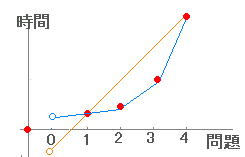 | ■3 最初の問題に着手するまでの時間 ■2で述べたように,各頁には操作ボタン以外の特別なものはなく,一覧形式で提示している教材では,読者の視線がどの文章を見ているのかは直接には分からない.このため,ある解説が分かりやすいかどうか,その解説はその場所に必要かどうかなどを読者の行動から判断するために,「解説が読まれた時間」「操作方法が納得できるまでにかかった時間」=「最初の問題に着手するまでの時間」が手掛かりとなる. 右図において赤丸で示した点が時間を測定できる箇所とする. 中学数学の用語で言えば,右の直線の傾きが「1題当たりの所要時間」になる.この場合において,初めの解説が読まれた時間は右図○の時間を推定すれば求まる.(切片を求める) 切片を推定するために,第1問完了時間から「1題当たり所要時間」(平均値)を引く方法が考えられるが,右図2のように実際に使う問題配列では,番号が進むほど難しくなるのが普通で,その場合第1問完了時間から1題当たり「平均」所要時間を引くと負の値となり,うまく求まらない.(朱色で示したもの) そこで,1題当たり所要時間の平均値を使うのをやめ,単純に第2問完了時間との差を引いて右図○の時間を求めることにした.(2次,3次,・・曲線による近似でもよい.) このようにして,第1問と第2問が問題形式,問題文の長さ,難易度などでほぼ同質のものであれば,後者の方法により,そうでないときは前者の方法によることとした. 各頁において「3題以上解答すれば送信可能」としたのは,一方においては空データの繰り返し送信を防ぐためでもあるが,他方においては第1問〜第3問の解答時間が凸凹になっていないかどうかを確かめるためでもある. |