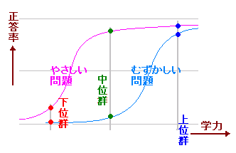 (当サイトでの実際の運用) 当サイトの問題は,簡単なので正答率が非常に高いことが多い.しかしまた,数学を苦手とする読者も多いため,どんなにやさしい問題でも誤答・無答はある.そこで,機械的に上位27%,下位27%をとると,正答率100%と正答率0%に近いものに分かれ,問題ごとの差異は分からない.そこで,上下に折半して上位50%を上位群,下位50%を下位群とすることが多い. さらに上位群,中位群,下位群に分けると一層詳しく分かることがある. 次のグラフ(ロジスティック曲線)は,「むずかしい問題」と「やさしい問題」における学力と正答率のモデルで,やさしい問題においては中位群の正答率は上位群の正答率に近く,むずかしい問題においては中位群の正答率は下位群の正答率に近くなると考えられる. したがって,全体の正答率が高い(=やさしい)問題において中位群が上位群に近く,全体の正答率が低い(=むずかしい)問題において中位群が下位群に近いときは,自然な分布になっていると判断できる. ![]() 問題ごとの識別力を示す指標としてはI-T相関,I-R相関があり,これらを併用する.(下記) なお,異質な解答状況となる生徒や問題を見分ける方法として,古くからSP曲線を利用する方法があり,S注意係数,P注意係数がよく用いられている.当サイトでは問題の分析のみを行い生徒の分析は行わなわず,問題の分析はI-R相関やU-Lグラフなどで代用できるので,P注意係数は用いていない. |