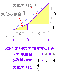 x の増加量 (変化の割合)と(x の増加量)が分っていて,(y の増加量)が分らないとき,(変化の割合)と(x の増加量)から(y の増加量)を求めるには,上の式を変形して 例 x が 1 から 3 まで増加するときの変化の割合が で, x が 3 から 6 まで増加するときの変化の割合が 1 のとき, x が 1 から 6 まで増加するとき: x の増加量は (3 - 1)+(6 - 3) = 2 + 3= 5 y の増加量は ×2+1×3=1+3=4 だから, x が 1 から 6 まで増加するときの変化の割合は となります. ![]() 変化の割合を足しても,「全体の変化の割合」になりませんが,x の増加量や y の増加量を足すと,「全体の x の増加量」「全体の y の増加量」になります. これらの割合(比)から「全体の変化の割合」が求まります. |