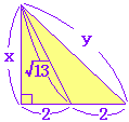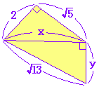 xは直角三角形の斜辺だから x2=22+(√5)2=4+5=9 x=3 次に,下半分の直角三角形で√13は斜辺だから