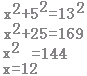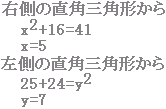 xは直角三角形の斜辺だから x2=32+42=25 x=5 次に,もう一つの直角三角形でもxは斜辺だから