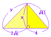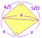 xは直角三角形の斜辺だから x2=(4√3)2+(2√13)2=48+52=100 x=10 次に,下半分の直角三角形でxは斜辺だから