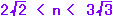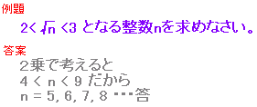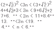 ※この問題は2乗せずに近似値で解けます。近似値であればよく、正確な値は必要ありません。 2・1.4・・<n<3・1.7・・ 2.8・・<n<5.1・・ n = 3, 4, 5 |