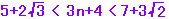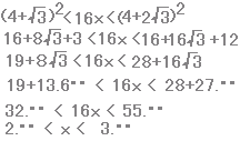 ※この問題は2乗せずに近似値で解けます。近似値でよく、正確な値は必要ありません。 5+2・1.7・・<3n+4<7+3・1.4・・ 5+3.4・・<3n+4<7+4.2・・ 8.4・・<3n+4<11.2・・ 4.4・・<3n<7.2・・ 1.・・<n<2.・・ n = 2 |