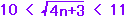 2乗で考えると 100<4n+3<121 97<4n <118 24.・・<n<29.・・ n=25,26,27,28,29 |
