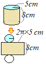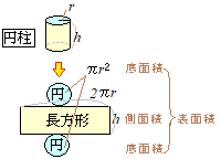 ○円柱の表面積は,2つの底面積と側面積の和になります.○右図のように底面の半径がr,高さがhである円柱の側面は長方形で,側面積は 2πr×h になります. |