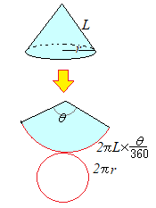 【要点1.2】≪円錐の側面積≫ ○円錐の側面積を求めるには,まず展開図の扇形を描いて,その中心角を求めることから始めるとよい. ○右図のように底面の半径がr,母線の長さがLである円錐の側面は扇形になり 底面の円周と扇形の弧の長さと一致するはずだから 次に半径がLで中心角がθ°の扇形の面積は,半径がLの円の面積πL2の だから ※この式(2)を覚える必要はないでしょう.(1)で扇形の角度を求めて,(2)で面積を求めるという手順が分かればOKです. (2)自体は次の図でも示せます. (他の考え方1) ![]()