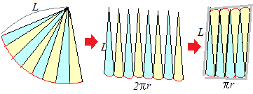 玉ねぎ形に切って,皮を広げていくと考える.右図のように 底辺が2πr 高さがL の三角形になるから,その面積は |