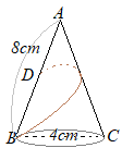 【3.2 展開図.円錐の側面】右の図のような円すいがあり,点Aは円すいの頂点で,線分BCは底面の直径である。また,点Dは,母線ABの中点である。AB=8 cm,BC=4 cm であるとき,次のア,イの問いに答えなさい。なお,円周率にはπをそのまま用いよ。 ア. 略 イ. 図のように,点Bから側面に沿って,母線ACを横切るように点Dまで線を引く。このような線のうち,最も短い線の長さは何cmか。 (香川県1999年入試問題)