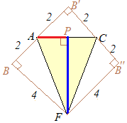 したがって,ACの中点をPとおくと, また,△ABFにおいて,三平方の定理を使うと さらに,△APFにおいて,三平方の定理を使うと △ACFの面積は ※この展開図において,たまたまBFB”B’は正方形になるが,他の問題でもそうなるとは限らない. |
