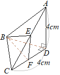 【3.6 展開図.中線の長さ】右の図のように,AD=BD=CD=4 cm ,∠ADB=∠ADC=∠BDC=90°である三角すいABCDがある。辺ACの中点をEとし,辺CD上を点Cから点Dまで移動する点をFとする。このとき,次の(1)〜(3)の問いに答えなさい。 (1)(2) 略 (3) EF+FBの長さが最も短くなるとき,次の@,Aの問いに答えなさい.
