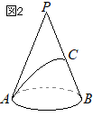 (2) 線分PBの中点をCとする。図2のように、この円錐の表面に,点Aから点Cまで,ひもをゆるまないようにかける。ひもの長さが最も短くなるとき,その長さを求めなさい。(長野県2017年入試問題)