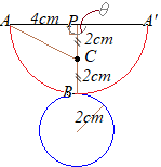 (2) 底面の半径は2 cmだから,右図で青で示した円周の長さ2π×2=4π cm.一方,赤で示した扇形の中心角をθとおくと,その弧の長さLは4πに等しくなるから そこで,右図の△APCは∠APC=90°の直角三角形になる. ACは展開図において直線になるとき最短になるから,三平方の定理を使ってAC間の距離を求める. |