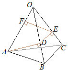 【3.5 展開図.直角二等辺三角形】右の図のように,OA=OB=OC=4 cm ,∠AOB=∠BOC=∠COA =45°の三角すいOABCがある。点Aから辺OBに垂線ADを引き,点Dから辺OCに垂線DEを引き,点Eから辺OAに垂線EFを引く。 このとき,(1)〜(4)の各問いに答えなさい。 (1)(2)(3) 略 (4) 三角すいOABCに,点Aから点Fまで,辺OB,辺OCの順に交わるようにひもをかける。ひもの長さが最も短くなるとき,ひもの長さを求めなさい。 (長崎県2017年入試問題)