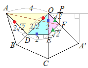 ∠AOB= ∠BOC= ∠COA= 45°だから,垂線AD,DE,EFを引くと,右図のようにそれぞれ直角二等辺三角形ができる.このとき,AP= 5 cm,PF= 1 cm,AP⊥PFになる. AFが最短になるのは,この展開図においてAFが直線になるときだから,三平方の定理を使ってAFの長さを求めると |