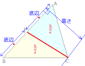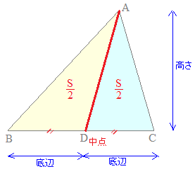 の公式で求められます.次の図のように,△ABCの頂点Aから対辺BCの中点(真ん中の点,1対1に内分する点)Dに線分ADをひくと,△ABDと△DCAとは,底辺が等しく,高さが共通になるから,これら2つの三角形の面積は等しくなります.(高さは底辺と垂直(直角)な線分で測ります) ![]()