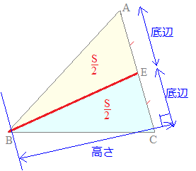 次の図のように,頂点Bから対辺CAの中点Eに線分BEをひいた場合にも,同様にして△BCEと△BAEの面積は等しくなります.