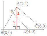 3点A(2, 4), B(0, 0), C(6, 0)を頂点とする△ABCがある. 線分BC上の点D(4, 0)を通り△ABCの面積を二等分する直線と線分ABの交点Eの座標を求めてください