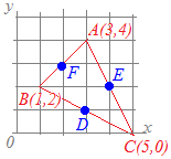 3点A(3, 4), B(1, 2), C(5, 0)を頂点とする△ABCがある. (1) 辺BC上に点Dをとって,線分ADが△ABCの面積を二等分するようにするとき,点Dの座標を求めてください. (2) 辺CA上に点Eをとって,線分BEが△ABCの面積を二等分するようにするとき,点Eの座標を求めてください. (1) 辺AB上に点Fをとって,線分CFが△ABCの面積を二等分するようにするとき,点Fの座標を求めてください.