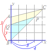 ○Q(0, y)とおき,AB, QBを底辺と考えると,底辺の長さの比はAB:QB=3:y○高さの比はC, Pのx座標の比になるから4:3 ○三角形の面積は (面積)=(底辺)×(高さ)÷2 だから,面積の比は (底辺1)×(高さ1):(底辺2)×(高さ2) Q(0, y)とおくと, 底辺の比は3:y 高さの比は4:3 よりy=2 Q(0, 2)…(答)