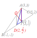 3点A(3, 3), B(−1, −1), C(5, 2)を頂点とする△ABCがある. 線分BC上の点P(3, 1)を通り△ABCの面積を二等分する直線と線分ABの交点をQとするとき,点Qの座標を求めてください
