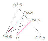 3点A(2, 4), B(0, 0), C(6, 0)を頂点とする△ABCがある. 線分AC上の点P(3, 3)を通り△ABCの面積を二等分する直線と線分BCの交点をQとするとき,点Qの座標を求めてください. 解説