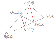 3点A(3, 6), B(0, 0), C(8, 4)を頂点とする△ABCがある. 線分BC上の点P(6, 3)を通り△ABCの面積を二等分する直線と線分ABの交点をQとするとき,点Qの座標を求めてください 解説