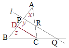 (1)直線ℓが△ABCの3辺またはその延長と右図のように,P, Q, Rで交わり,AP:PB=3:2, CR:RA=1:4であるとき,BC:CQを最も簡単な整数の比で表してください.