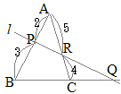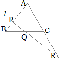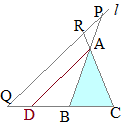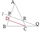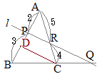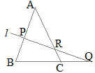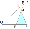 (3)直線ℓが△ABCの3辺の延長と右図のように,P, Q, Rで交わり,QB:BC=3:2, CA:AR=5:1であるとき,PA:ABを最も簡単な整数の比で表してください.