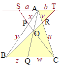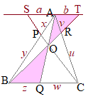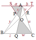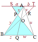 (相似図形を利用する証明)点Oが△ABCの内部にある場合 AからBCに平行な直線をひき,CP, BRの延長との交点をS, Tとし,AP=x, PB=y, BQ=z, QC=w, CR=u, RA=v, SA=a, AT=bとおくと