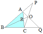 (3)右図のように△ABCの外部に点Oをとり,Oと頂点A, B, Cを結ぶ直線がそれぞれ辺AB, BC, CAまたはその延長と交わる点をP, Q, Rとする.PA:AB=2:3, BC:CQ=2:1であるとき,CR:RAを最も簡単な整数の比で表してください.