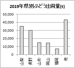 【例1.1】右のグラフは,2019年都道府県別ぶどう出荷量(単位t)--農林水産省公表資料--を縦棒グラフにしたものです. 元のデータは,北海道から始まる都道府県番号順に並んでいますが,グラフにするときは, A) 元の都道府県順, B) 数量の多い順(少ない順) が考えられます.このグラフではBの数量の多い順として,上位5県までと他の合計を表示したものです.