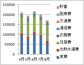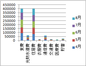 Excelで挿入→縦棒グラフを選ぶと,一旦,次の図のようになって,できてほしいものと違う形のグラフになります.月毎の支出の小計が表示されるようにするには,グラフをクリックしてから,Excel上端のメニューから,デザイン→行/列の入れ替え,を選びます.